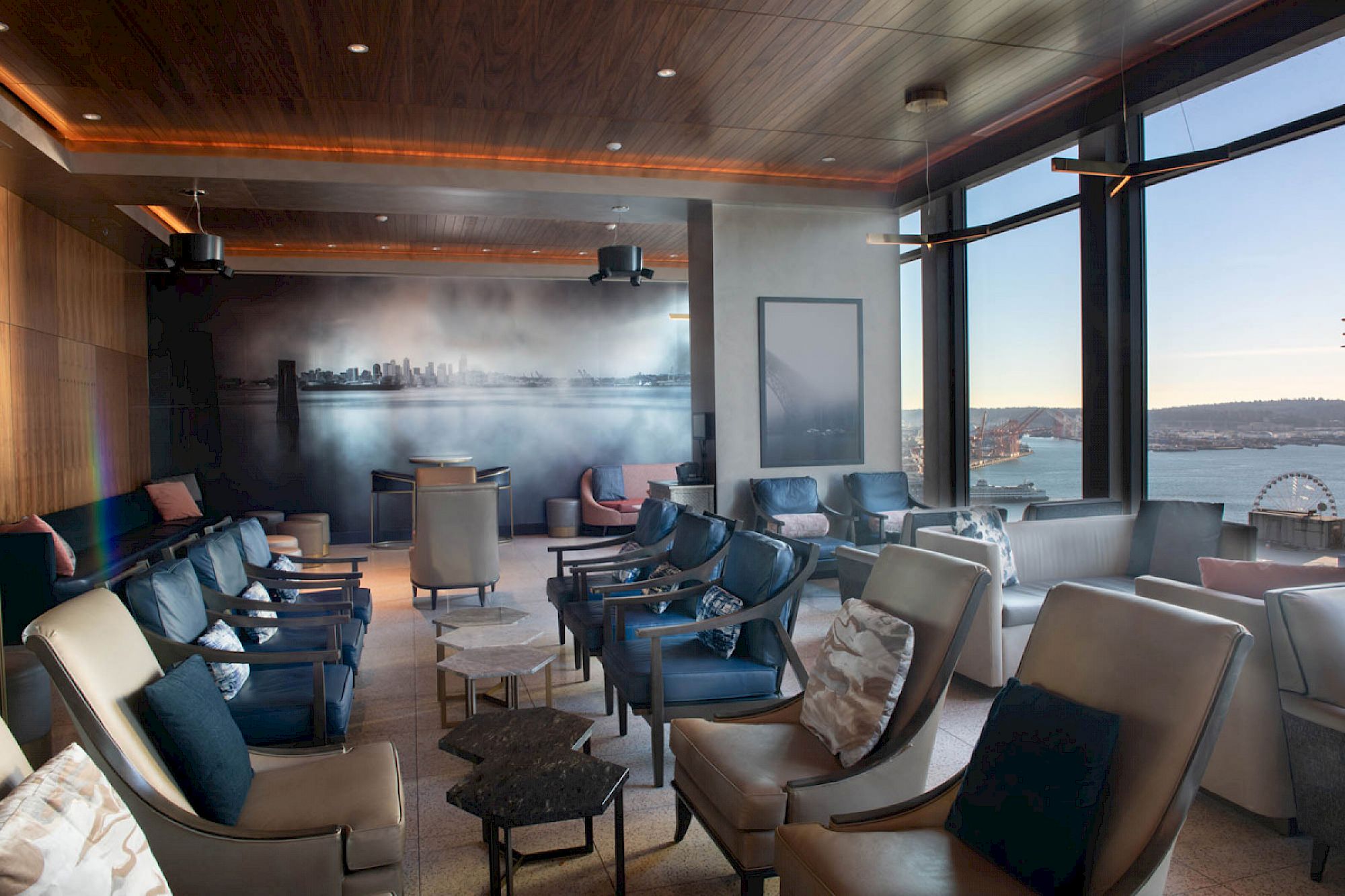 Elegant bedroom with a blue and white theme, modern furnishings, and decorative items